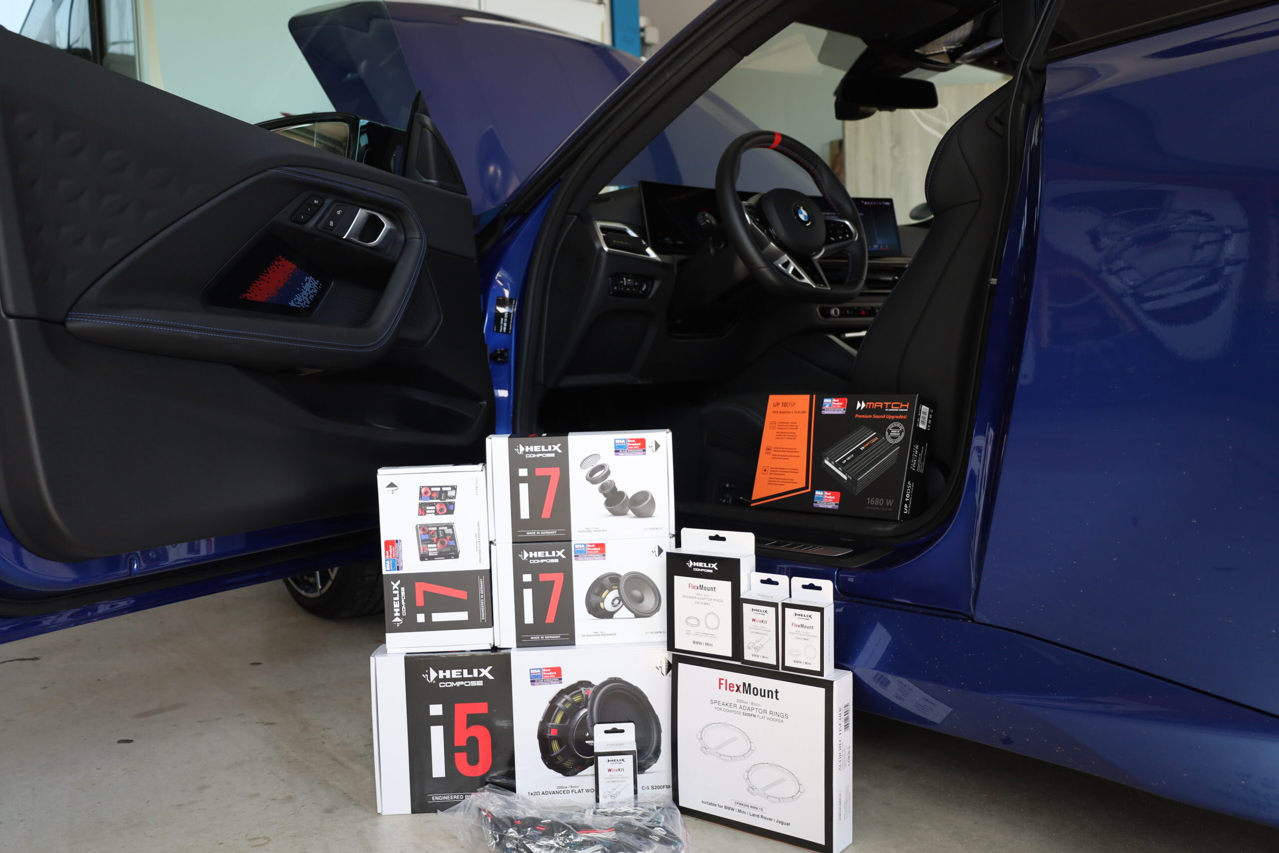 HELIX Ci7 T20FM-SC Hochtöner, HELIX Ci7 M100FM-S3 Mitteltöner, HELIX Ci7 FX-UNI.2 Frequenzweichen und HELIX Ci5 S200FM-S2 Tieftöner sorgen gemeinsam für ein klares, detailreiches Klangbild. Ergänzt wird das System durch HELIX CFMK200 BMW.1S Untersitzwoofer, die den Bassbereich im Innenraum kraftvoll unterstützen.