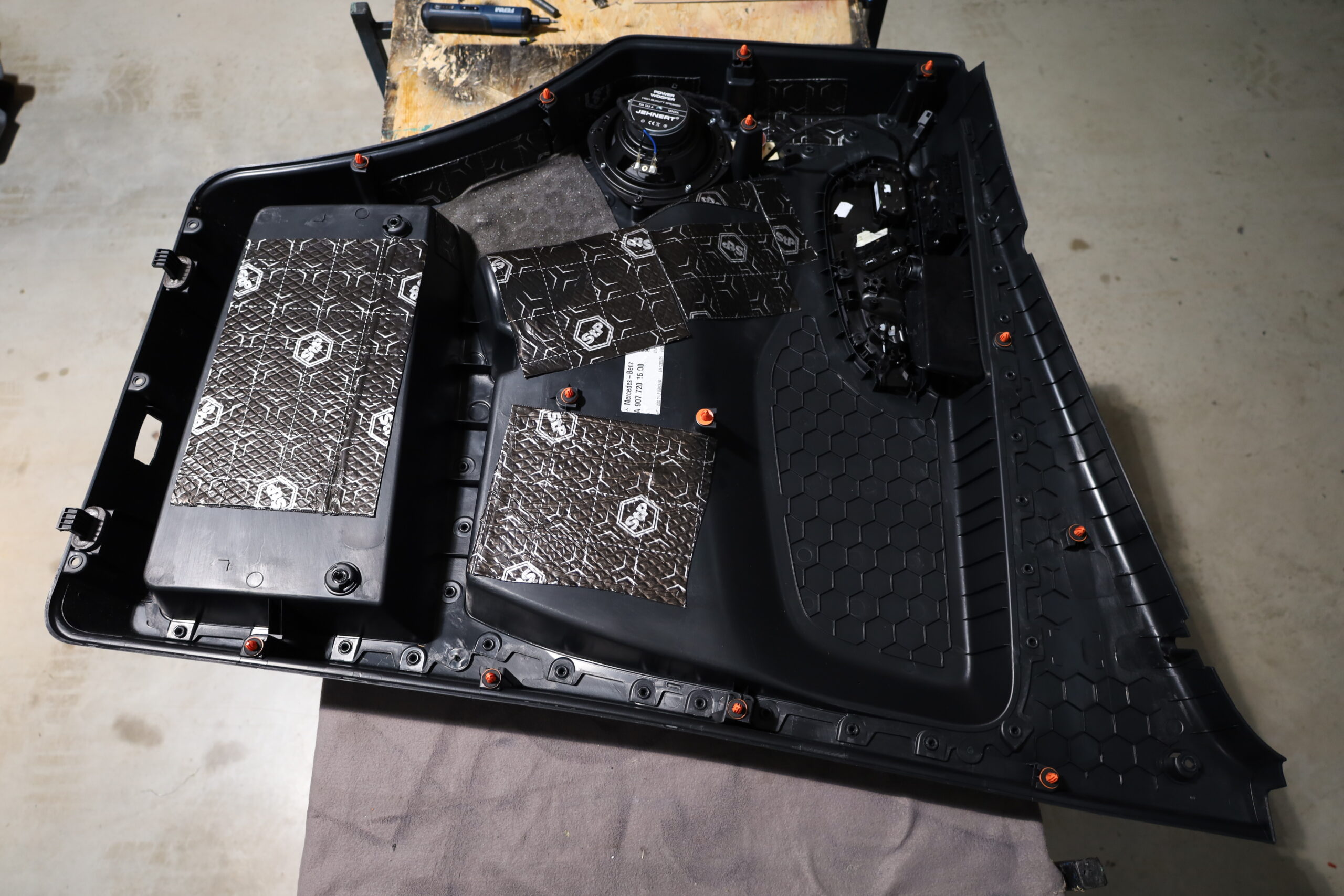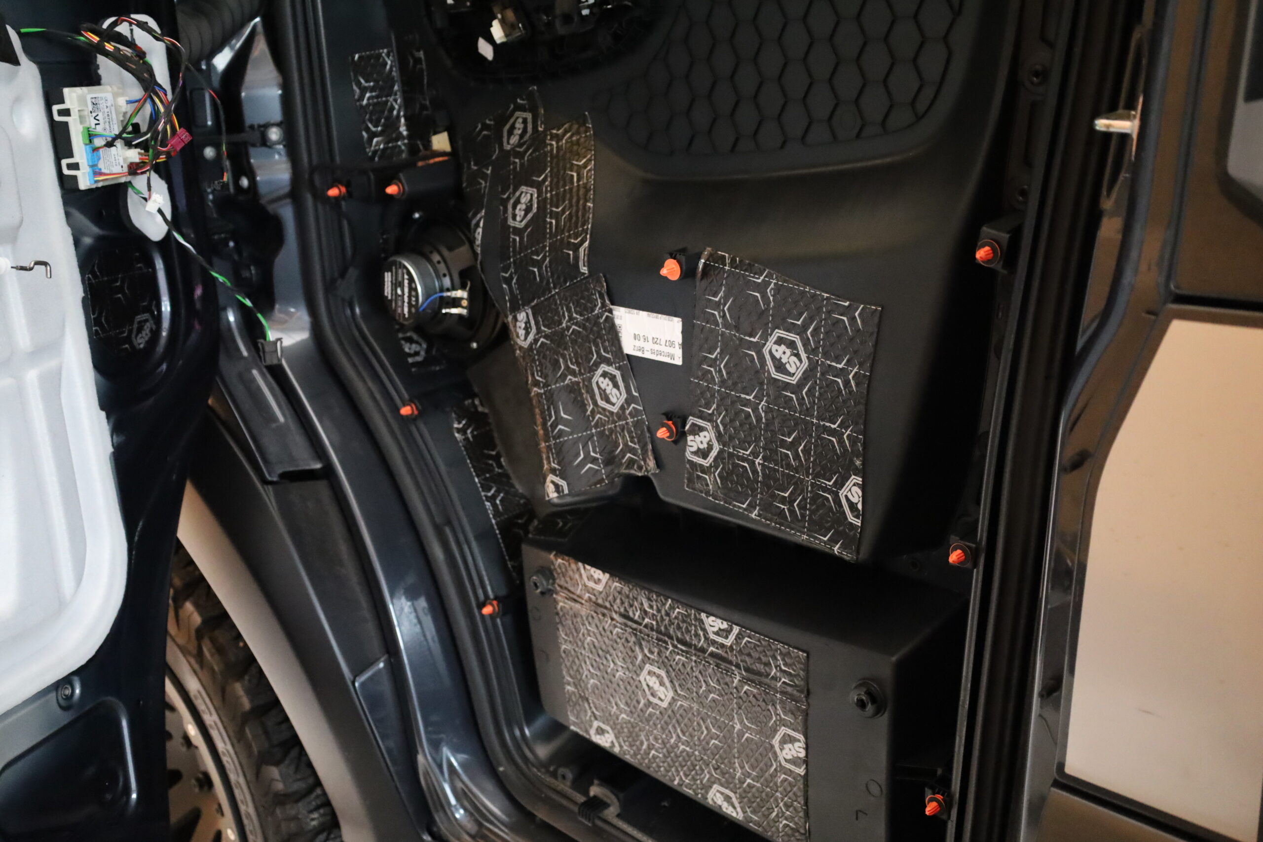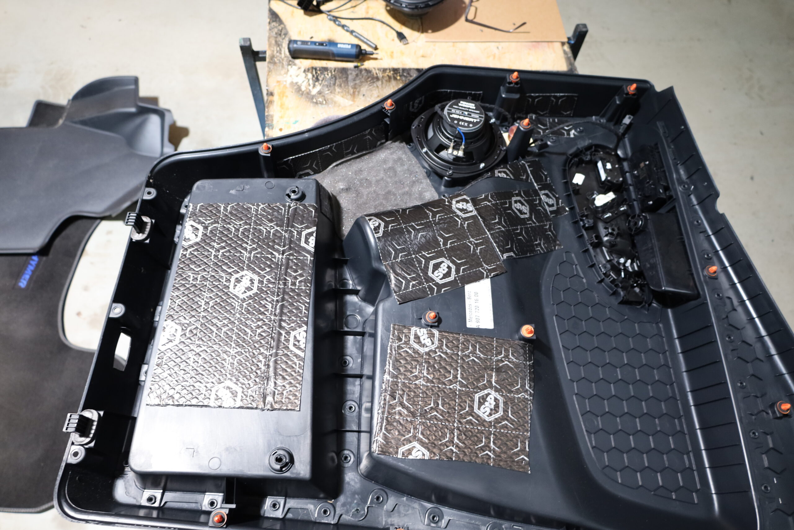 Für das Bassfundament kam ein HELIX IK W8 DVC 2×2 Ohm Subwoofer zum Einsatz. Zusätzlich wurden die Fahrzeugtüren sorgfältig gedämmt, um störende Vibrationen und Resonanzen zu minimieren und die Klangqualität zu optimieren.