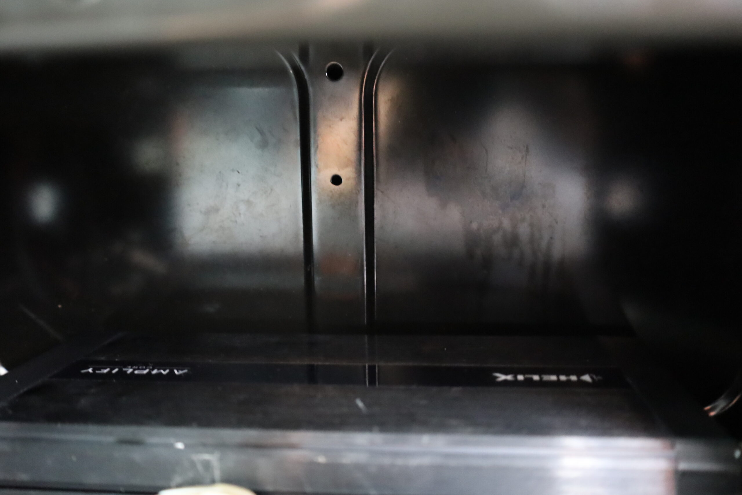 Das Bassfundament liefert ein HELIX IK S10 DVC 2×2 Ohm Subwoofer, der in einem individuell gefertigten und seitlich sichtbaren Gehäuse installiert wurde.